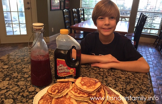 When the center of the pancake begins to bubble, flip it over and brown the other side. Serve with hot maple syrup (or homemade strawberry syrup, if you are lucky enough to have received a bottle as a gift as we did. I have no idea how to make it).